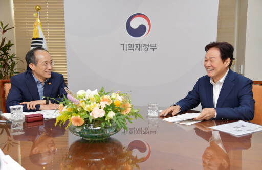 ▲박완수 경남도지사(오른쪽)가 9일 오전 정부서울청사에서 추경호 경제부총를 만나 경남 현안사업에 대한 국비 지원을 요청하고 있다. 경남도 제공 |