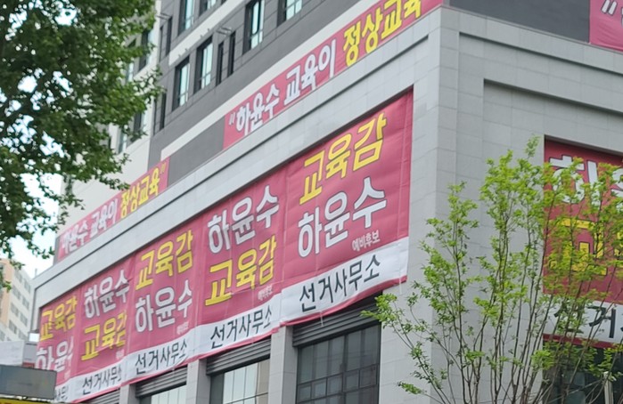 ▲부산 부산진구 동해선 부전역 인근에 위치한 하윤수 부산시교육감 후보 선거사무소 전경. |