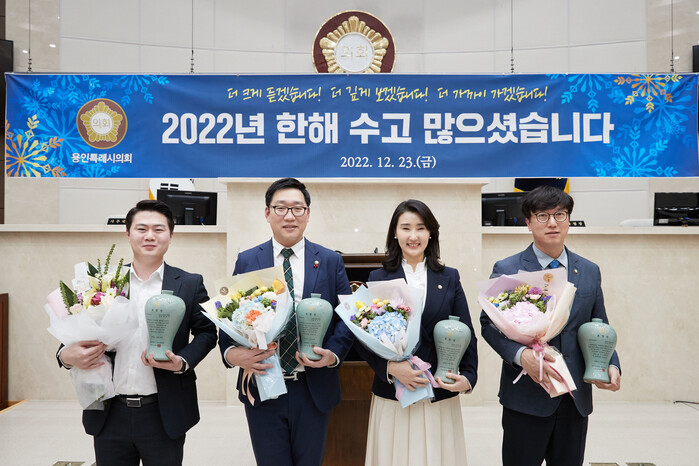 [로컬세계=고기훈 기자]경기 용인특례시의회 김병민(구성동,마북동,동백1동,동백2동/더불어민주당), 박은선(보정동,죽전1동,죽전3동,상현2동/국민의힘), 강영웅(풍덕천1동,풍덕천2동,죽전2동/국민의힘), 박병민(비례대표/더불어민주당) 의원이 23일 제9회 경기동부권시‧군의장협의회 의정활동 우수의원상을 수상했다.