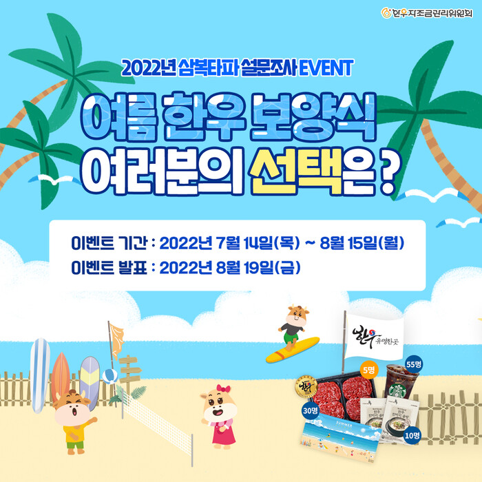 추첨을 통해 총 100명에게 ▲5만 원 상당의 한우고기 ▲한우 한 마리 곰탕 5팩 ▲한우 캐릭터 비치타올 등을 경품으로 증정한다. 당첨자 발표는 8월 19일이다.