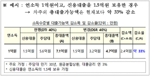 신용대출 등 기타대출이 많은 차주의 경우, DTI만 적용하는 경우보다 대출한도가 줄어들게 될 것이다.