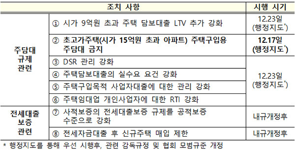 초고가주택(시가 15억원 초과 아파트) 주택구입용 주담대 금지→ 12월17일(대책발표일 익일)부터 시행한다.