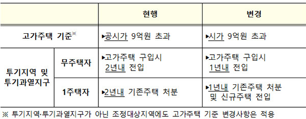 금번 조치에 따라 투기지역과 투기과열지구에서는 주택구입목적 주택담보대출을 받고자 하는 경우, 1주택세대는 1년내 기존 주택을 처분하고 신규주택에 전입하는 것을 조건으로, 무주택세대는 고가주택(시가 9억원 초과)을 구입하는 경우에 1년내 전입하는 것을 조건으로 가능하다.