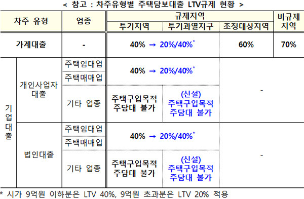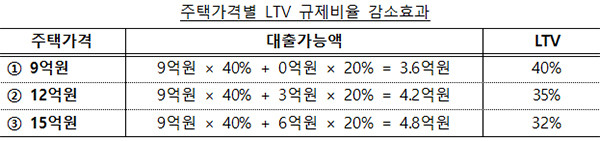 동 방안에 따르면, LTV 규제비율을 주택가격에 따라 최대 8%p 낮아지는 효과(40%→32%)가 있다.