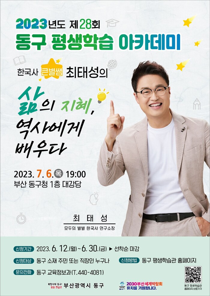 [로컬세계 부산=기우치 기자]부산 동구는 다음 달 6일 오후 7시 동구청 대강당에서 한국사 일타 강사 ‘큰별쌤’으로 사랑받고 있는 최태성 강사를 초청하여 제28회 동구 평생학습 아카데미를 개최한다고 8일 밝혔다.