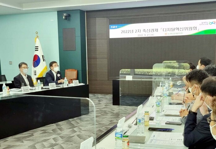 ▲ 21일 서울시 중구 농협중앙회 본관에서 열린 2022년 제2차 축산경제 디지털혁신위원회에 참석한 위원들이 축산농가 디지털서비스 개선방안에 대해 토의하고 있다. 농협 제공 |