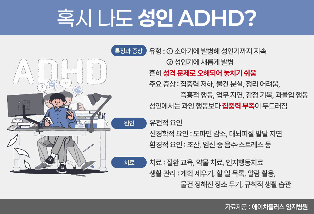 많은 사람들이 ADHD를 소아 청소년기에만 발생하는 질환으로 오해하지만, 실제로는 성인기까지 이어지거나 성인이 되어 새롭게 발병하기도 한다. 단순히 타고난 성격이나 성향 탓으로 치부해 제때 치료받지 못하는 경우가 많아 주의가 필요하다.