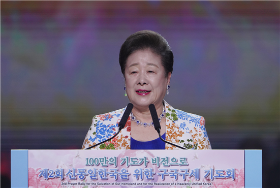 ▲9일 세계 종교지도자들이 참여한 가운데 ‘100만의 기도가 비전으로’라는 주제로 개최된 ‘제2회 신통일한국을 위한 구국구세 기도회’에서 한학자 총재가 창설자 연설을 하고 있다. 가정연합 제공 |