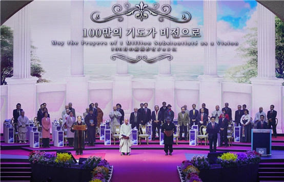 통일합심 기도에서는 남북 공동수교 157개국을 대표하는 종교지도자들이 애국가에 나오는 ‘하느님’을 부모로 모시고 남북이 이념적 대립과 분단을 극복하는 ‘신한반도’를 기원했다.