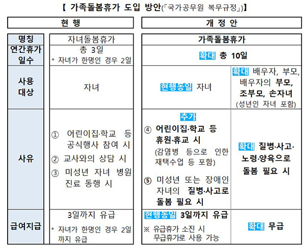 이렇게되면 공무원은 자녀뿐 아니라 배우자와 부모(배우자의 부모 포함), 조부모, 손자녀를 돌봐야 하는 경우 특별휴가인 가족돌봄휴가를 사용할 수 있다.