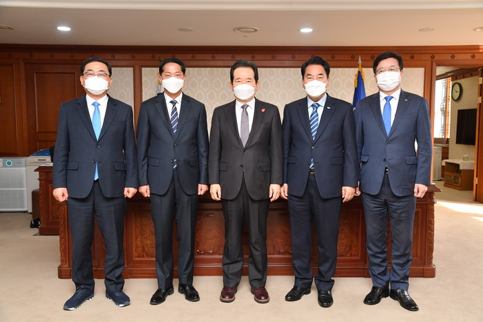 ▲염태영 시장(오른쪽부터), 백군기 용인시장, 정세균 국무총리, 이재준 고양시장, 허성무 창원시장이 면담 후 함께하고 있다. 국무총리실 제공 |