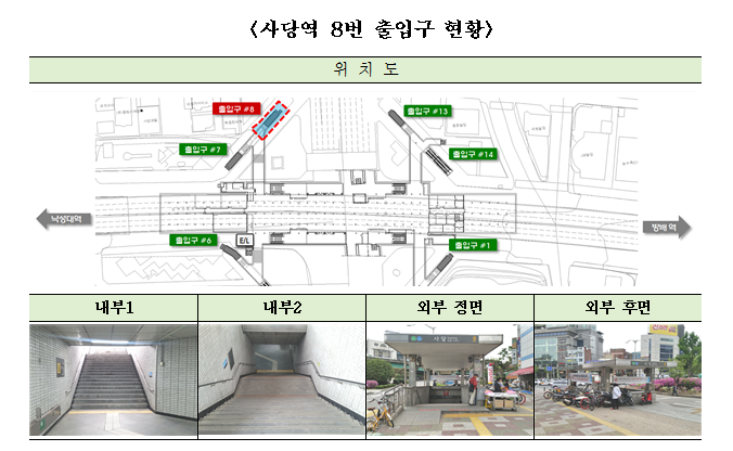 사당역은 2호선과 4호선이 지나는 환승역으로, 일평균 17만1000여 명의 승객이 이용할 만큼 서울을 대표하는 역으로 활용되고 있으나, 에스컬레이터가 설치된 3, 4, 5번 출입구와 달리 8번 출입구에는 에스컬레이터가 없어 통행이 불편하다는 민원이 계속 제기돼 왔다.