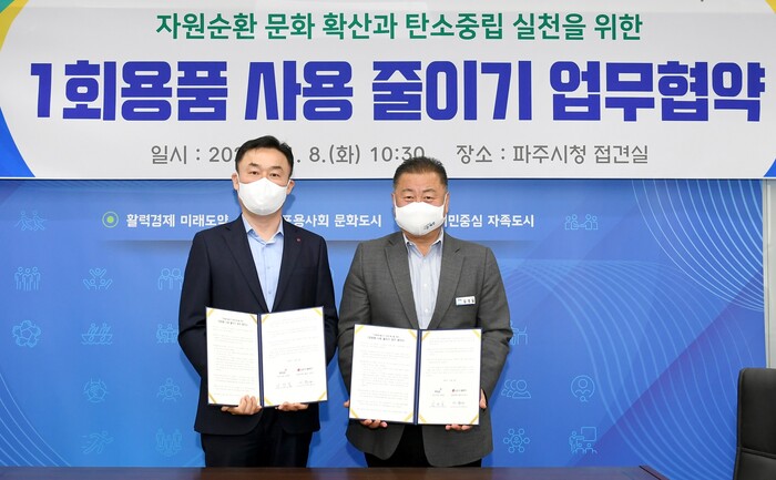 [로컬세계 = 이영원 기자]경기 파주시(시장 김경일)와 LG디스플레이는 8일 시청에서 자원순환 문화 확산과 탄소중립 실천을 위해 ‘일회용품 줄이기 업무협약식’을 개최했다.