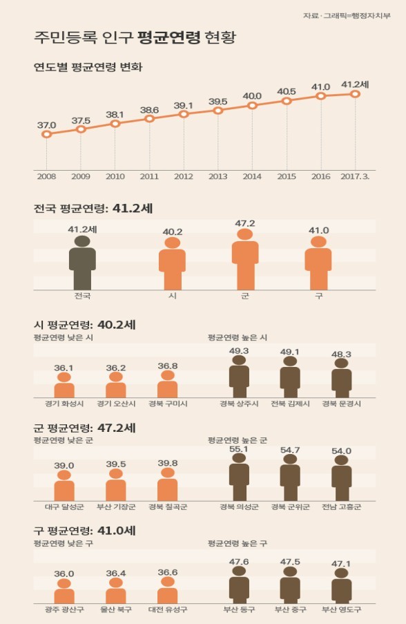 ’17년 3월 말 기준 주민등록 인구 평균연령은 41.2세로 ’08년(37.0세)에 비해 4.2세 늘은 것으로 집계됐다.