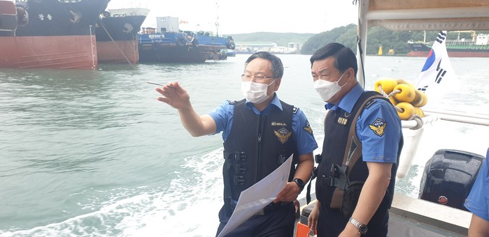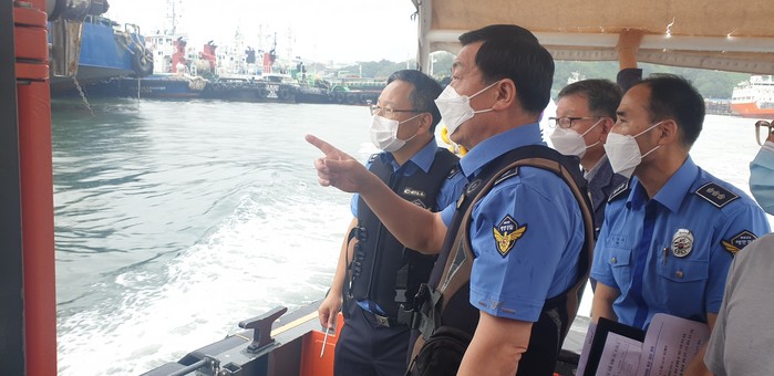 [로컬세계 맹화찬 기자]제10호 태풍 하이선 북상 대비 구자영 남해지방해양청장은 5일 오전 울산 장생포을 방문해 울산해경구조대 보트를 타고 항내 태풍대비 테세를 점검 하고 있다.(사진=남해지방해양청)