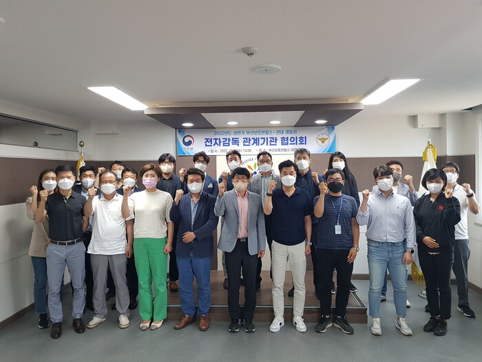 ▲부산보호관찰소 전자감독담당 특사경 직원과 부산경찰청, 산하 경찰서 관계자들이 '전자감독 관계기관 협의회'를 개최한 뒤 기념촬영을 하며 화이팅을 외치고 있다. 부산보호관찰소 제공 |