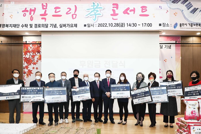 | ▲ 이상일 용인특례시장과 기흥노인복지관 후원금 전달식에 참여한 관계자들이 기념촬영을 하고 있다. 용인특례시 제공 |