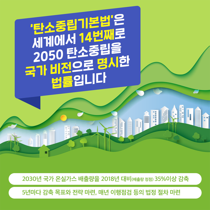 이번 탄소중립기본법 국회 통과는 우리나라가 세계에서 14번째로 2050 탄소중립 이행을 법제화하는 것으로, 이에 탄소중립 이행 절차를 체계화하고 기후영향평가와 기후대응기금 등의 정책수단을 추진할 계획이다.