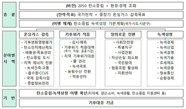 아울러 탄소중립을 이행하기 위해 국가 주요 계획과 개발사업 추진 때 기후변화 영향을 평가하는 기후변화영향평가제도와 국가 예산계획 수립 때 온실가스 감축목표를 설정·점검하는 온실가스감축인지예산 제도를 도입했다.