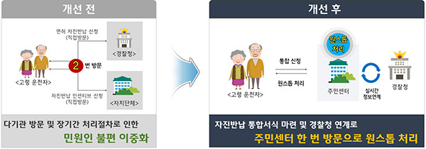 행정안전부와 경찰청은 고령 운전자 운전면허 자진반납과 인센티브 지원신청을 주민센터에서 한 번에 할 수 있도록 원스톱 서비스를 구축한다고 27일 밝혔다.