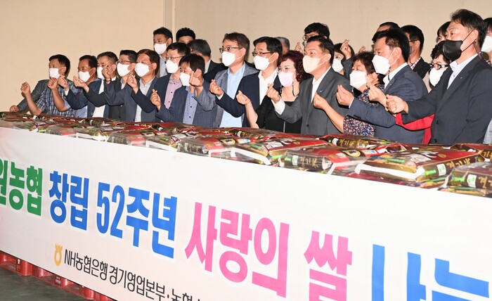수원농협은 8일 수원농협 경제사업장에서 ‘수원농협 창립 52주년 사랑의 쌀 나눔행사’를 열고, 경기사회복지공동모금회 지정기탁 형식으로 수원시에 10㎏ 효원미 1000포(3300만 원 상당)를 전달했다. ‘효원미’는 수원에서 생산된 쌀 브랜드다.
