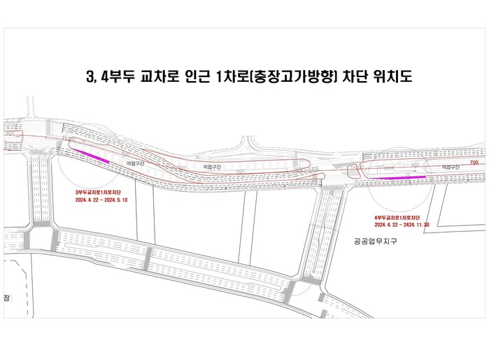 금회 교통 차단은 집중호우 시 지하차도 침수피해 방지를 위한 집수정 시설유지 관리계단 등 지하시설물 설치를 위해서 불가피하게 실시하는 상황으로, 충장대로(충장고가 방면) 4부두교차로 인근 1개차로를 이달 22일부터 11월 말까지 차단할 예정이다.