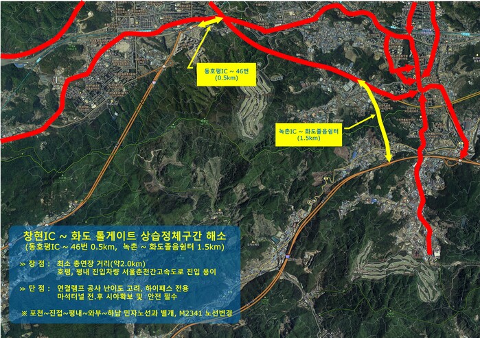 먼저 동호평IC와 46번 신경춘로(0.5km)를 연결하고 녹촌IC예정지와 화도졸음쉼터(1.5km)를 연결해 창현교차로와 화도IC를 경유하지 않고도 서울과 호평동, 평내동에서 진입하는 차량들을 효율적으로 분산시키는 방안을 제시했다.