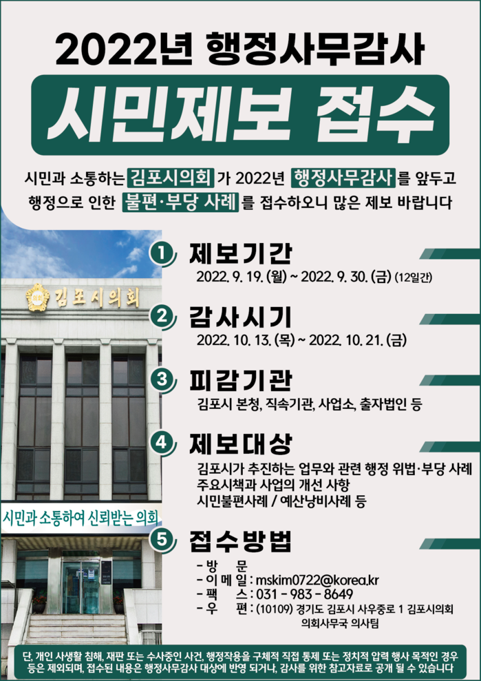 [로컬세계=김병민 기자]경기 김포시의회(의장 김인수)가 2022년도 행정사무감사를 앞두고 9.19일부터 9.30일까지 12일간 시민제보를 접수한다고 16일 밝혔다.