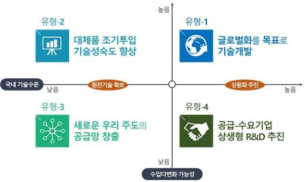 아울러 핵심품목을 국내 기술수준(역량)과 수입다변화 가능성을 기준으로 4개 유형으로 분류, 이를 바탕으로 유형별 R&D 대응전략을 마련했다.