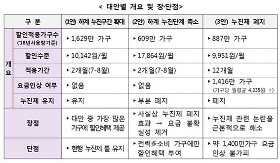 3개안은 ▲누진체계를 유지하되, 여름철에만 별도로 누진구간을 확대하는 방안(누진구간 확대안) ▲여름철에만 누진 3단계를 폐지하는 방안(누진단계 축소안) ▲연중 단일 요금제로 변경해 누진제를 폐지하는 방안(누진제 폐지안) 등이다.