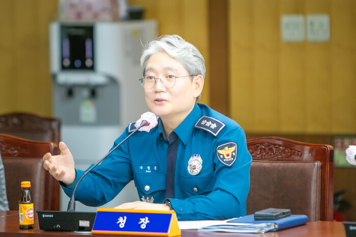 ▲부산경찰청 우철문 청장이 23일 부산경찰청 동백홀에서 관련 부서장 및 15개 경찰서장이 참석한 가운데 '범죄예방·대응 전략회의'를 주관하고 있다. 부산경찰청 제공 |