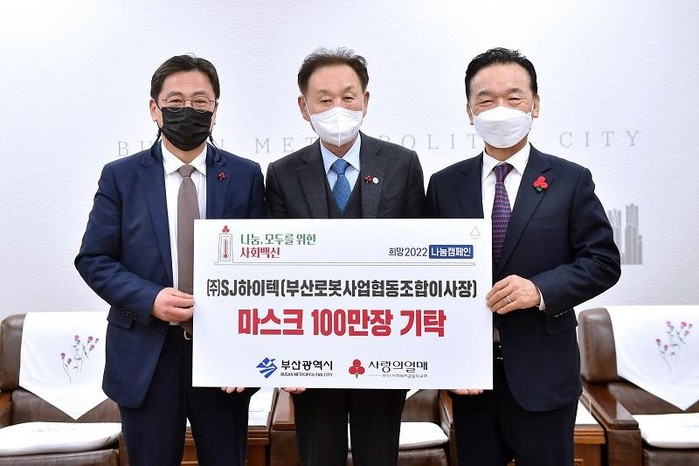 부산시는 SJ하이텍이 기부한 덴탈 마스크 100만장을 부산사회복지공동모금회에 기탁, 방역 취약계층과 학생 등에게 배부할 예정이다.