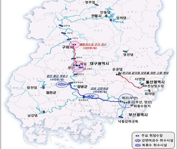 이 사업은 총 3가지로 ▲구미 해평취수장에서 대구·경북에 일평균 30만t을 공급하기 위한 관로 45.2km ▲합천 황강 복류수와 창녕 강변여과수를 개발하여 부산과 동부경남에 일평균 90만t을 공급하기 위한 취수시설 및 관로 102.2km ▲청도 운문댐에서 울산에 반구대암각화* 보호를 위한 물량을 공급하기 위한 관로 43.8km를 건설한다는 내용이다.