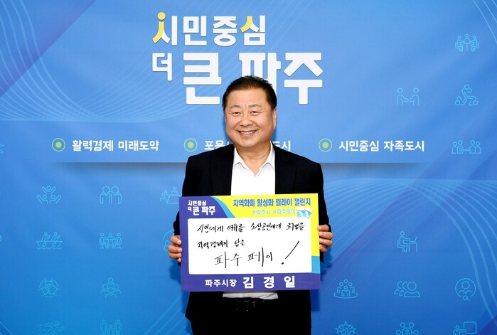[로컬세계 = 이영원 기자]김경일 경기 파주시장이 지난 26일 민생안정과 지역경제 활성화를 위해 ‘지역화폐 사용 함께해요 릴레이 챌린지’(이하 지역화폐 챌린지)에 동참했다.