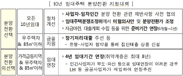이번 대책은 높은 분양전환 가격으로 인한 자금 조달문제 등으로 분양전환이 어려운 임차인의 주거불안 해소를 위해 실질적으로 추진 가능한 지원이 필요하다는 판단에 따른 것이다.