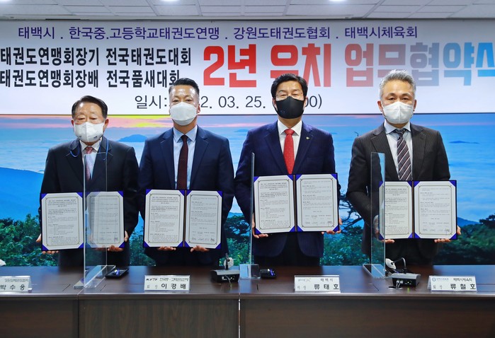 [로컬세계 박상진 기자]강원 태백시는 25일 오후 5시 시청 소회의실에서 ‘한국중고태권도연맹회장기 전국 태권도 대회 및 한국중고태권도연맹회장배 전국 품새대회’를 태백에서 개최하기로 업무 협약을 체결했다.