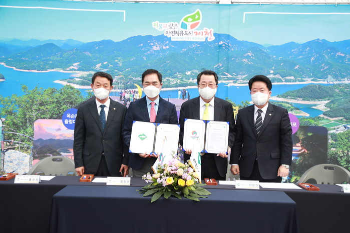 [로컬세계 김병민 기자]경기 평택시(시장 정장선)는 17일 충북 제천시와 양 도시의 공동번영을 위한 자매결연 협약식을 청풍호반케이블카 옥상정원에서 체결했다.