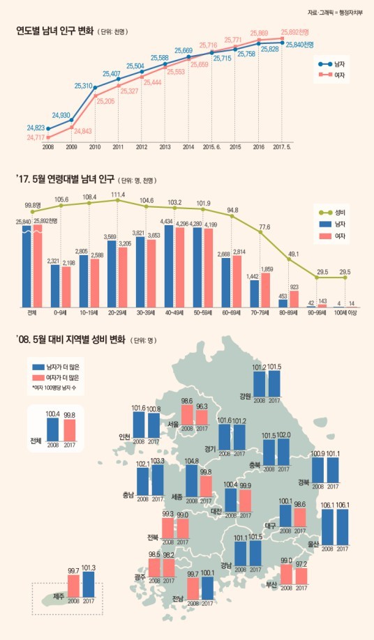 ’17년 5월말 주민등록 인구 성비(여자 100명당 남자 수)는 99.8명이고, 여자(2589만2225명)가 남자(2584만361명)보다 5만1864명 더 많다.