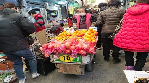 손수레 위에는 빛깔 좋은 밀감과 단감이 잔뜩 올려져 있다.