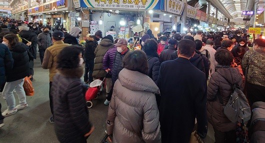 ▲31일 부산 부전시장 한복판에 위치한 삼거리에서 바라본 시장 풍경. 설날을 앞두고 제수용품을 사러 나온 시민이 인산인해를 이루고 있다. |
