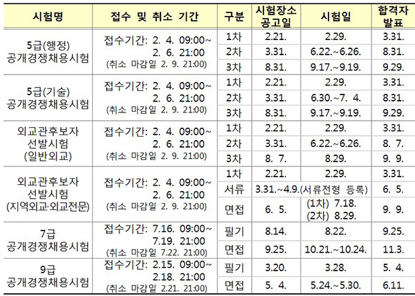 한편 시험 일정 외에 구체적인 시험 정보는 내년 1월 초 인사혁신처 누리집과 사이버국가고시센터 등에 게시하는 ‘2020년도 국가공무원 공개경쟁채용시험 등 계획공고’에서 자세히 안내할 예정이다.