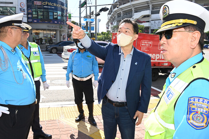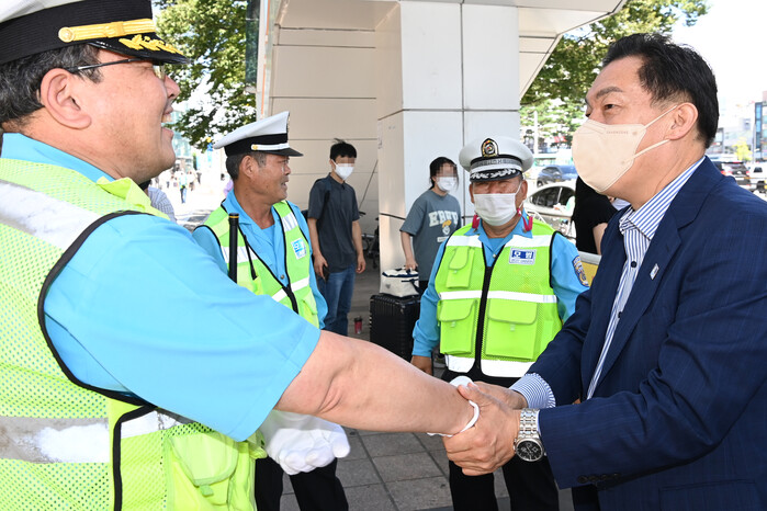 ▲ 이재준 시장이 교통정리 봉사를 하고 있는 수원모범운전자회 회원들을 격려하고 있다. |