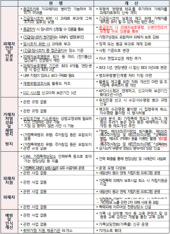 가해자를 엄벌하고 재범을 방지하기 위해 상습·흉기사범 등 중대 가정파탄사범에 대해서는 원칙적으로 구속영장을 청구하는 등 엄정 대처하기로 했다. 또 가정폭력범죄에는 ‘주거침입·퇴거불응죄’ 및 ‘불법촬영’ 등이 추가된다.