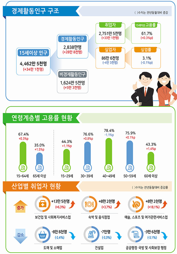 반면 도매 및 소매업(-8만8000명, -2.4%), 건설업(-7만명, -3.3%), 공공행정·국방 및 사회보장 행정(-3만6000명, -3.1%) 등에서는 감소했다.