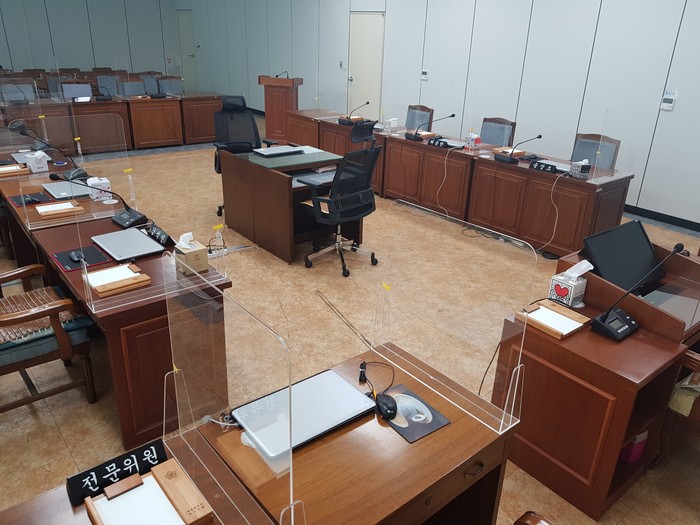 ▲부산서구의회 상임위원실에 설치한 비말차단 투명칸막이 모습. |