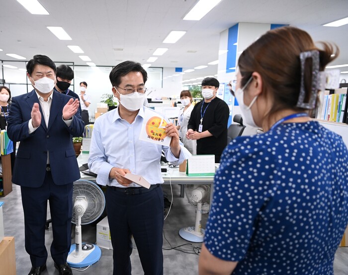 김 지사는 이날 경기도청 북부청사 각층에서 근무하는 직원들을 찾아 격려하고 대화를 나누는 시간을 가졌다. 특히 출산을 앞둔 직원을 만나 축하의 의미로 ‘피자 쿠폰’을 손수 전달하며, 건강을 기원하는 인사를 건넸다.