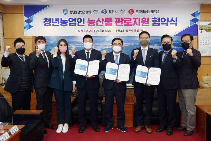 [로컬세계 권인진 기자]경남 창원시는 청년농업인의 발전과 소득증대를 위해 창원시 청년농업인연합회, 롯데백화점 창원점과 25일 시청 접견실에서 청년농업인 농산물 판로지원 상호 협력을 위한 협약을 체결했다고 밝혔다.