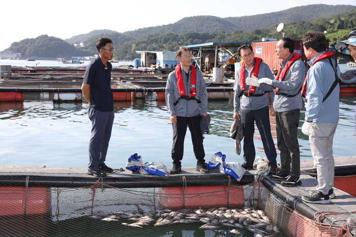 ▲ 노동진 수협중앙회장(왼쪽 두번째)이 25일 전남 여수시 돌산읍 군내리에 소재한 고수온 피해 양식장을 찾아 현장을 점검하고 있다. |