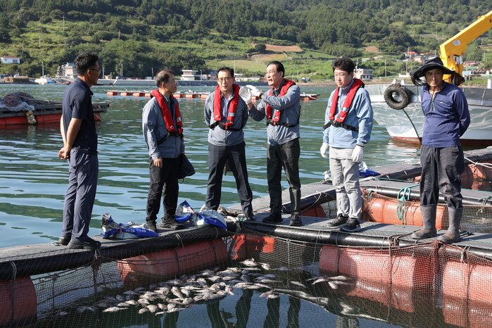 이날 여수시 돌산읍 군내리 양식장을 찾은 관내 조합장들과 함께 피해 현장을 살펴보고 어업인들로부터 후쿠시마 원전 오염수와 고수온 등과 관련해 의견을 수렴했다.
