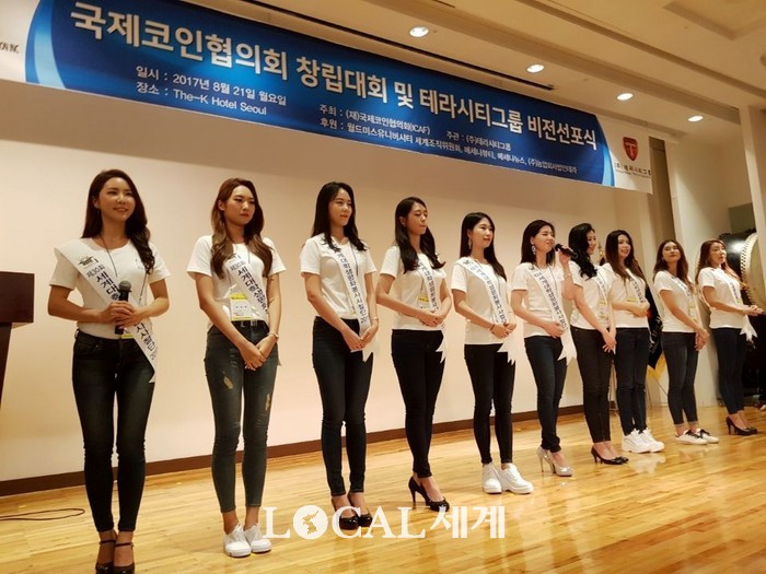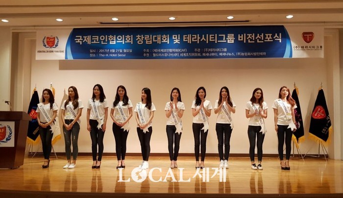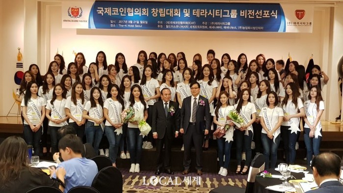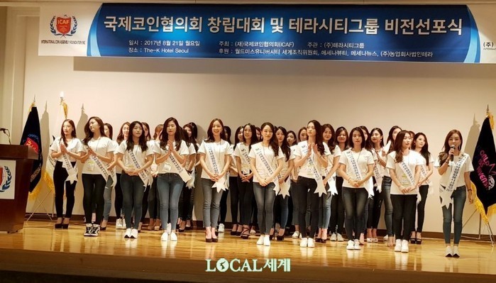 [로컬세계 김재덕 기자]우리 기업의 세계화를 꾀하고 지구촌 평화의 초석을 마련하기 위해 열리는 제30회 월드미스유니버시티 한국대회 참가자들이 테라시티그룹 국제코인협의회 창립대회 및 비전선포식에서 포즈를 취하고 있다.